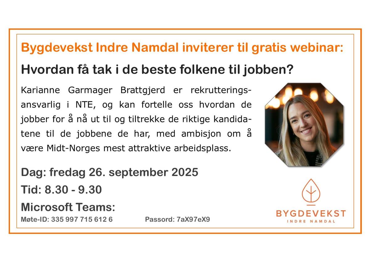 Bygdevekst Indre Namdal inviterer til gratis webinar.Lytt til tekstenStopp avspilling Sist endret 23.09.2025 08.21